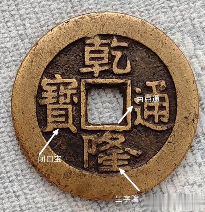 再比如乾隆通宝的“角头”通、“方头”通、“单点”通、“双点”通,或“开口”宝、“闭口”宝等等的不同,版别的不同之处就在这些细微差别之处。